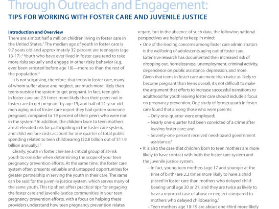 This tip sheet offers practical tips for engaging the foster care and juvenile justice communities in your teen pregnancy prevention efforts.